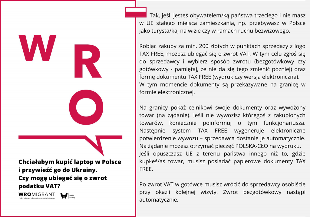 Robiąc zakupy za min. 200 złotych w punktach sprzedaży z logo TAX FREE, możesz ubiegać się o zwrot VAT. W tym celu zgłoś się do sprzedawcy i wybierz sposób zwrotu (bezgotówkowy czy gotówkowy – pamiętaj, że nie da się tego zmienić później) oraz formę dokumentu TAX FREE (wydruk czy wersja elektroniczna).